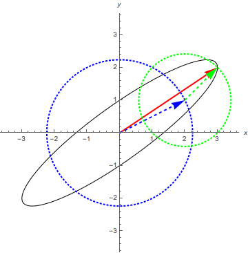 électrique est la somme de deux composantes circulaires de sens opposés et de normes différentes. La première, en bleu, est celle définie comme le phaseur ER dans le cours, et la seconde, en vert, est EL. La composante de module le plus grand, ici ER, détermine le sens de la polarisation elliptique. La différence des modules de ER et EL détermine le rapport d'aspect de l'ellipse. Le cas particulier de la composante circulaire pure correspond à ER=0 ou EL=0. Lorsque ER et EL ont le même module, la polarisation est rectiligne.