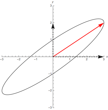 composantes n'ait pas la même norme, et ont une différence de phase non-nulle quelconque. Dans cet exemple particulier correspondant au cadre 38 du cours, E0x=3 et E0y=2-j, ce qui crée une ellipse avec un rapport a/b=4.44 et un angle d'inclinaison par rapport à l'axe des x de 35.8 degrés. Si l'on suppose que la propagation se fait suivant +z (respectivement