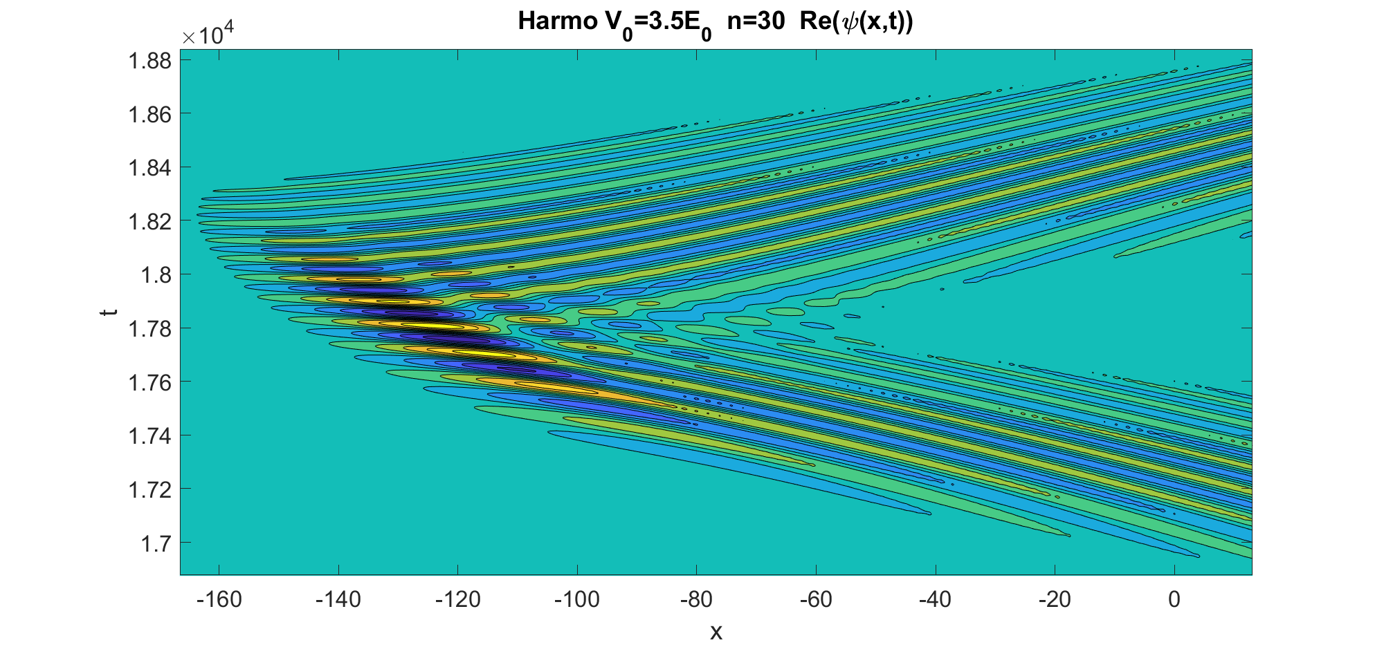 Fonction d'onde d''une particule quantique dans un potentiel harmonique lors de sa réflexion. Schéma semi-implicite de Crank-Nicolson.